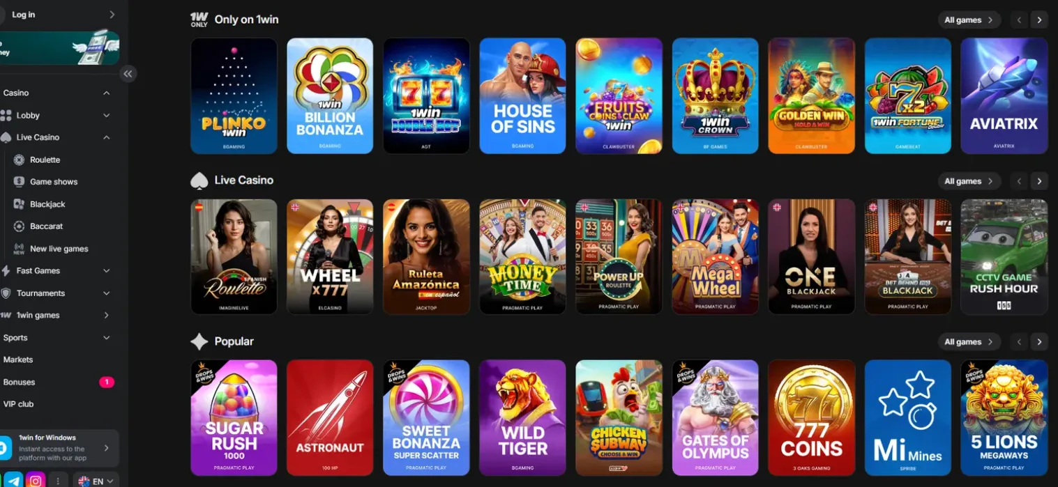 Nuestra recomendación: comprobar en la versión peruana del sitio los filtros por proveedor antes de depositar, porque 1win adapta su catálogo según acuerdos comerciales y jurisdicción.